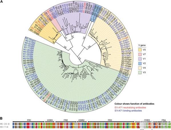 近期,复旦大学余宏杰课题组在肠道病毒A71型(EV-A71)人源单克隆抗体研究领域取得进展,研究结果以“Antibody signatures in hospitalized hand, foot and mouth disease patients with acute enterovirus A71 infection”为题,于6月1日在线发表在PLOS Pathogens。在本研究中,余宏杰课题组从5名3岁以下EV-A71感染的HFMD病例中鉴定出8个中和抗体,包括2个IgG和6个IgM。分析抗体重链可变区基因发现,EV-A71中和抗体偏好使用IGHV5-51基因,并且发现两个来自不同病例的中和抗体使用相同的重链可变区基因,这是首次在人源EV-A71中和抗体中发现这些现象。
