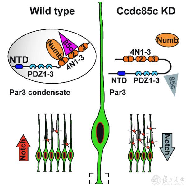 近日,复旦大学脑科学研究院解云礼研究员课题组与生物医学研究院温文玉研究员课题组合作,在Cell Reports在线发表了Ccdc85c-Par3 condensates couple cell polarity with Notch to control neural progenitor proliferation的研究论文。该研究运用了生物化学等手段揭示了神经干细胞中极性蛋白通过相分离方式调控其增殖与分化,为深入理解大脑神经发生提供了新的见解。该研究揭示了Ccdc85c这一极性蛋白在神经干细胞发育过程中的作用,并证实了Ccdc85c是与Par3极性蛋白的结合后通过相分离的方式募集更多的Numb,从而维持神经干细胞中的Notch信号通路水平,确保神经干细胞实现增殖与分化间的平衡。该研究解析了神经干细胞极性蛋白精确调控其增殖分化的分子机制,为深入了解大脑神经发生提供了新的见解。