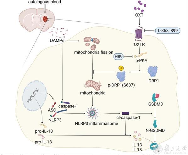 复旦大学脑科学研究院/医学神经生物学国家重点实验室肖雷课题组和华山医院重症医学科宫晔团队合作,于2023年6月15日在Stroke杂志上发表题为“Oxytocin Improves Intracerebral Hemorrhage Outcomes by Suppressing Neuronal Pyroptosis and Mitochondrial Fission”的研究论文,揭示催产素治疗可改善脑出血后的神经功能损伤、减轻神经炎症和焦亡、抑制线粒体过度分裂,其保护作用可能通过OXTR/p-PKA/DRP1信号通路实现。